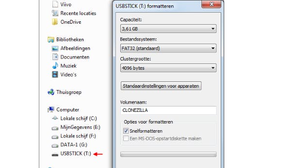 Beschikt je systeem niet over een cd/dvd-speler, dan ben je aangewezen op een live-stick. Daarvoor heb je het zip-bestand van CloneZilla gedownload. Stop een usb-stick in je pc, open de Verkenner, klik met de rechtermuisknop op de stationsletter van die stick en kies Formatteren. Het Bestandssysteem stel je in op FAT32, de Clustergrootte laat je ongemoeid. Kies een geschikte Volumenaam. Het vinkje bij Snelformatteren mag je laten staan. Druk op Starten om te formatteren. Houd er rekening mee dat alle eventuele data op die stick nu verdwijnen!