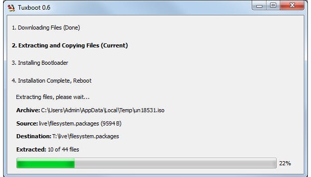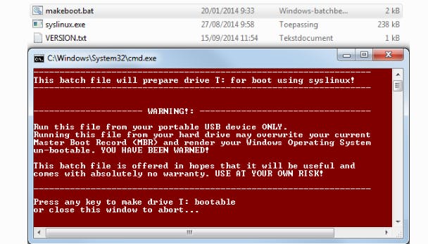 Vanuit de Verkenner kopieer je de complete inhoud van het zip-bestand naar je stick: klik op het zip-bestand met de rechtermuisknop en kies Alles uitpakken. Verwijs naar je stick (niet naar een mapje op de stick!) en bevestig met Uitpakken. Na afloop open je in de Verkenner achtereenvolgens de submappen \utils en \win32 op je stick. Hier klik je dan het bestand makeboot.bat met de rechtermuisknop aan. Kies Als administrator uitvoeren. Je krijgt een melding dat je stick bootable zal worden gemaakt. Druk een willekeurige toets in om verder te gaan.