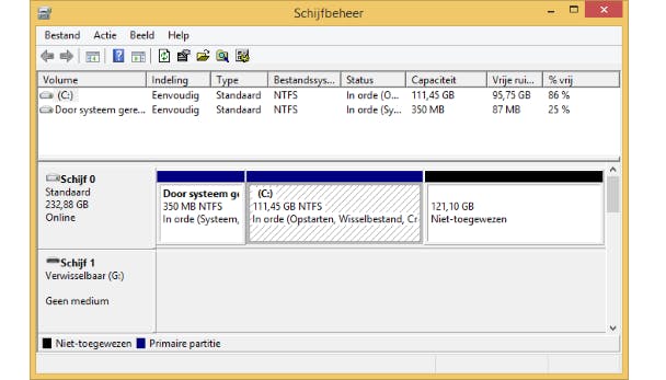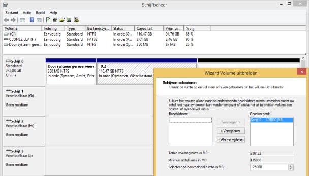 In principe heb je nu twee mogelijkheden. Je kunt de gekloonde partitie groter maken en de niet-toegewezen schijfruimte toevoegen aan de partitie. Klik die partitie hiervoor met de rechtermuisknop aan, kies Volume uitbreiden, druk tweemaal op de knop Volgende en op Voltooien. Een andere mogelijkheid is dat je van die niet-toegewezen ruimte een afzonderlijke partitie maakt. Daarvoor klik je die ruimte met de rechtermuisknop aan en kies je Nieuw eenvoudig volume. Druk op tweemaal op Volgende, kies een geschikte Volumenaam en bevestig met Volgende en met Voltooien.