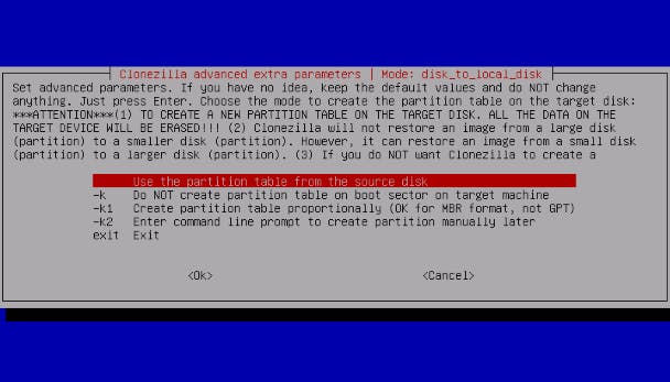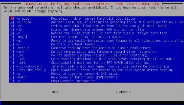In stap 8 gaven we al aan dat er ook een 'Expert mode' beschikbaar is. Hiermee is het bijvoorbeeld mogelijk CloneZilla de partitietabel en het bestandssysteem van een kleinere bronschijf automatisch te laten aanpassen aan de opslagcapaciteit van een grotere doelschijf, zodat ingrepen zoals in stappen 11 en 12 niet nodig zijn. Kies daarvoor Expert mode en local_disk_to_local_disk_clone. Geef zowel de bron- als de doelschijf aan en aanvaard de standaard ingestelde parameters (controleer dat ook de parameter -r van een asterisk is voorzien), evenals de optie Skip checking/repairing source files.