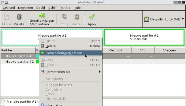 Vervolgens zorg je ervoor dat de doelschijf op dezelfde manier als de bronschijf is gepartitioneerd, dus hetzelfde aantal partities, dezelfde grootte en bootvlag. Daarbij houd je nog een stuk ongebruikte, niet-toegewezen schijfruimte over op de doelschijf. Ook dat doe je met Gparted. Start nu CloneZilla op. Deze keer kies je voor local_partition_to_local_partition_clone. Vervolgens duid je de (eerste) bronpartitie aan, gevolgd door de doelpartitie waarop je alle data van de geselecteerde bronpartitie wilt plaatsen. Kies na afloop eventueel Start over om zo ook (op dezelfde manier) de overige partitie(s) te klonen.
