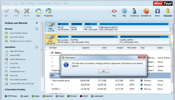 Blijkt de uitlijning niet zoals het hoort, dan kun je dat alsnog bijsturen, bijvoorbeeld met de gratis MiniTool Partition Wizard Home Edition. Installeer dit programma en start het op. Klik in het grafische overzicht je SSD-schijf aan en selecteer Align All Partitions in het linkerpaneel. De tool analyseert de partitie en deelt je mee wanneer die al in orde blijkt te zijn. Is dat niet het geval, dan verneem je welke partitie(s) alsnog moeten worden uitgelijnd. Klik dan linksboven op Apply. Dat vergt wel een (automatische) herstart van Windows.