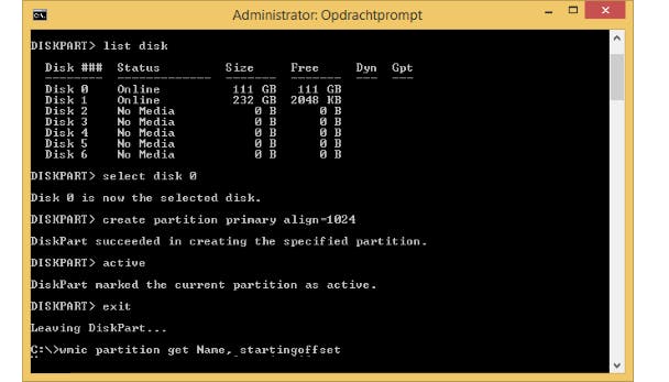 In plaats van pas na het klonen van de schijf de uitlijning te corrigeren, kun je ook vooraf de uitlijning van je SSD optimaliseren. Start voordat je gaat klonen de pc met Windows op vanaf je harde schijf. Open de opdrachtprompt als administrator en voer deze opdrachten uit, waarbij je x vervangt door de stationsletter van je SSD: