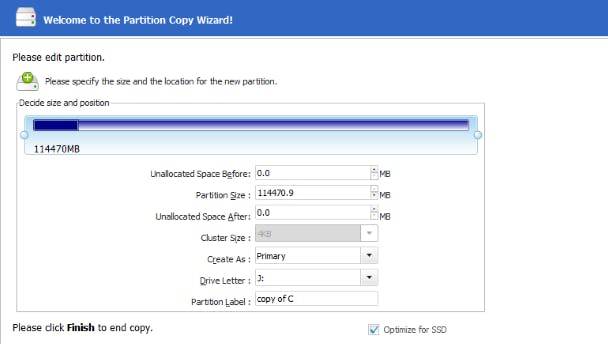 Clonezilla is minder geschikt om een bronpartitie te klonen naar een kleinere doelpartitie. Als dit je situatie is, vind je een oplossing in EaseUS Partition Master Free. Het komt erop neer dat je eerst de bronpartitie selecteert, waarna de tool die analyseert (onder meer op de hoeveelheid gebruikte data). Vervolgens duid je een stuk 'unallocated space' aan op je SSD als doellocatie. Zorg dat er een vinkje staat bij Optimize for SSD en bevestig met Apply. De tool zorgt zelf voor een dynamische herschaling van de bronpartitie zodat die op de doellocatie van de SSD past.