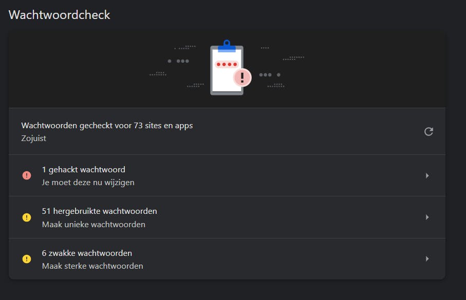 Chrome toont de gehackte, hergebruikte en zwakke wachtwoorden.