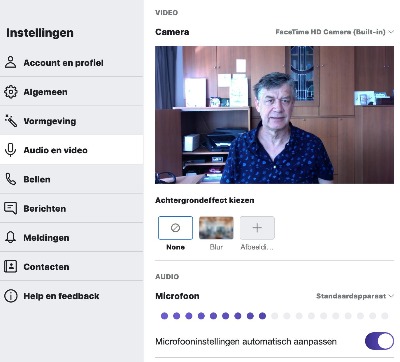 In deze instellingen selecteer je het onderdeel Audio en video. Hier kun je de optie Mijn achtergrond vervagen voor alle oproepen inschakelen. In sommige versies moet je het achtergrondeffect Blur selecteren. Wanneer je al in een videogesprek zit, kun je deze optie ook activeren zonder naar de instellingen te gaan. Klik met de rechtermuisknop op het videopictogram zodat er een voorvertoning van de webcam opent. Onder dit kleine voorbeeldvenster kun je de vervaging activeren.