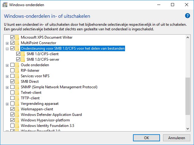Er verschijnt nu een lijst met Windows-opties die je aan- of uit kunt zetten. Scroll in de lijst naar beneden tot je een optie Ondersteuning voor SMB 1.0/CIFS voor het delen van bestanden tegenkomt.