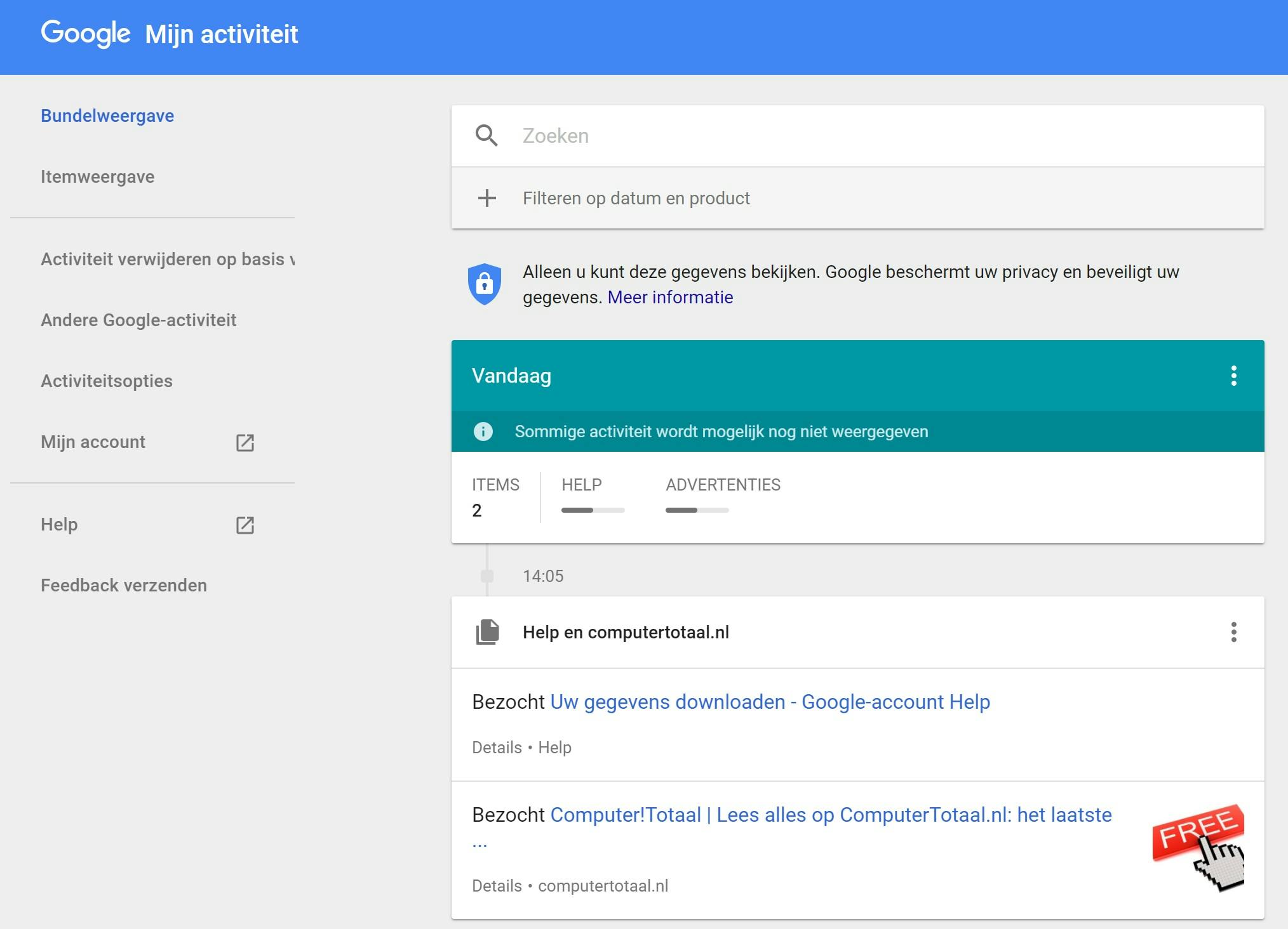 Deze data kan volgens Google niet door derden worden ingezien, maar sommige mensen willen het toch liever gewoon verwijderen. Dit kun je doen door op de Mijn activiteit pagina in te loggen met je Google-account. Klik op het hamburgermenu en selecteer Activiteit verwijderen op basis van. Klik op het drop-downmenu en kies Aangepast of Onbeperkt. Klik op Voor en kies de huidige datum. Vervolgens worden alle gegevens verwijderd.