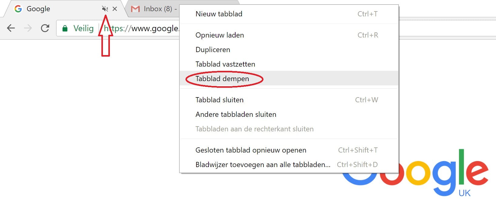 Let op: Als je een tabblad dempt en vervolgens zelf probeert om een video of audio af te spelen, zal hiervan ook het geluid gedempt worden totdat je het dempen opheft.