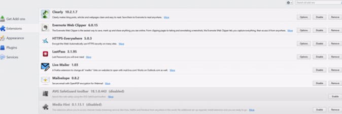 Om te beginnen moet je about:addons in de adresbalk typen, op Enter drukken en vervolgens in het linker navigatiepaneel op Extensions klikken. Je kunt een extensie uitschakelen door op de Disable knop van een add-on te klikken. Nadat je een add-on hebt uitgeschakeld is het een goed idee om Firefox opnieuw op te starten om er zeker van te zijn dat de wijziging wordt toegepast.