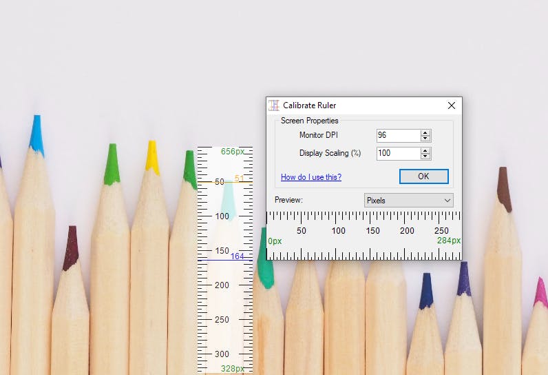 Via de rechtermuisknop kun je de schermliniaal ook verticaal gebruiken en met de instelling Stay on Top zorg je dat de liniaal niet verdwijnt als je een andere applicatie opent. In de instellingen selecteer je de maateenheid: pixels, centimeters, inches, punten of procenten. Als je de liniaal over de volledige breedte van het scherm uitrekt, kom je uit bij 100%. Je kunt de liniaal immers zelf vergroten en verkleinen. In de standaardinstelling is dekking ingesteld op 80%, zodat je de achtergrond toch een beetje door de liniaal kunt zien. Handig wanneer je markeringen wilt aangeven. Wil je nauwkeuriger kunnen werken, gebruik dan de instelling Calibrate Ruler. Dan geef je de schermresolutie op, bijvoorbeeld 96 pixels per inch en noteer je het zoompercentage waarop het object wordt weergegeven, bijvoorbeeld 100%.