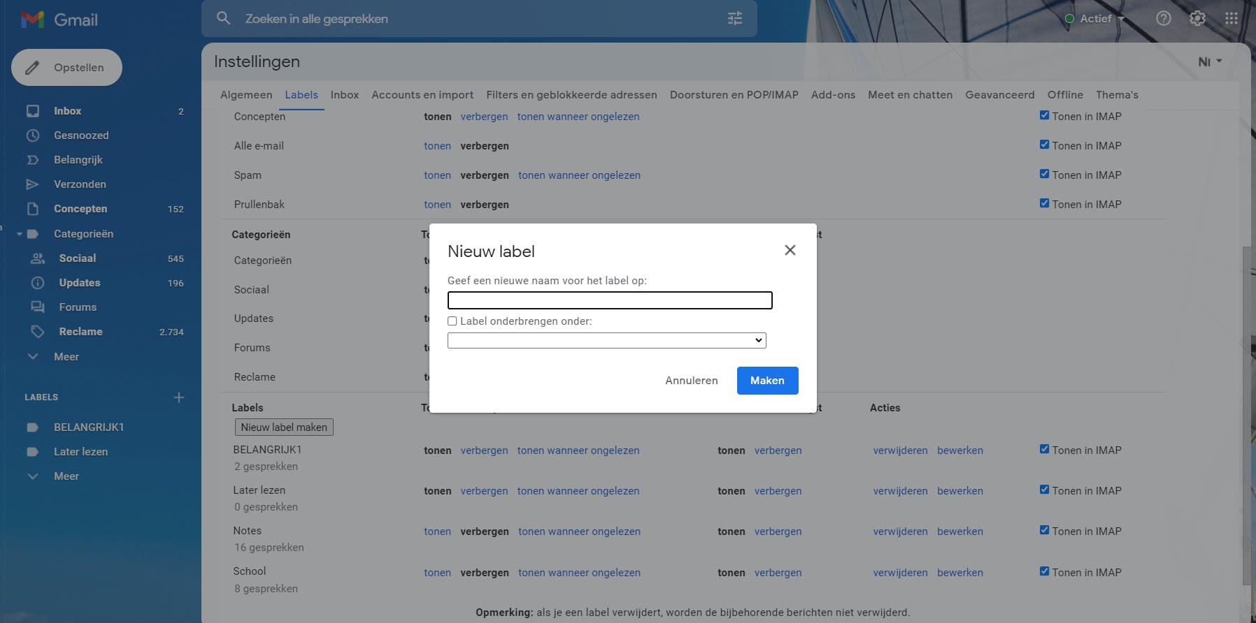 Log in op je Gmail-account, klik rechtsboven in het scherm op het tandwieltje en daarna op Alle instellingen bekijken. Klik op het tabblad Labels. Scrol naar beneden en kies voor Nieuw label maken. Geef het label een naam. In dit menu kun je bij Label onderbrengen onder ook aangeven of je een subfolder wil aanmaken voor je bestaande labels.