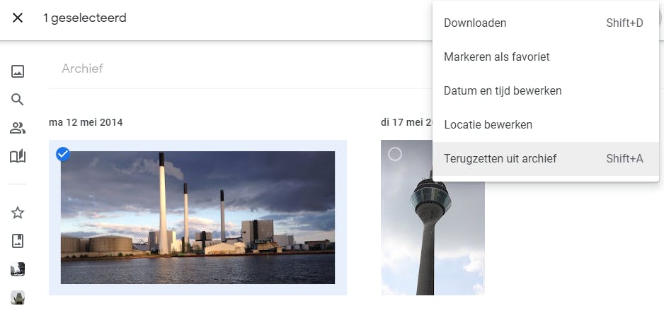 Op je pc ga je naar photos.google.com om naar je fotocollectie te gaan. Klik op een foto en daarna op de drie verticale puntjes. Hier vind je de optie Archiveren. De toetsencombinatie Shift+A werkt ook.