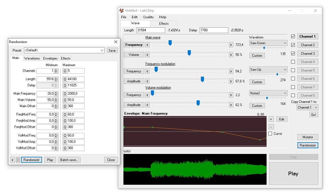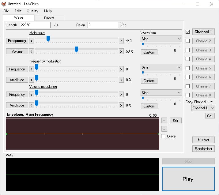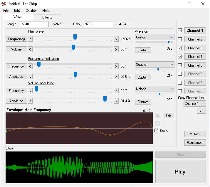 Het programma heeft twee tabbladen: Wave en Effects. Het creëren van geluid gebeurt in Wave. Je duidt hierin aan hoeveel kanalen je wilt gebruiken. Er zijn maximaal acht kanalen. Selecteer een kanaal en bepaal bij Length de duurtijd van het geluid, standaard staat één seconde ingesteld. Je kunt ook een vertraging instellen met Delay. Daarna versleep je de schuifjes van Frequency modulation en Volume modulation.