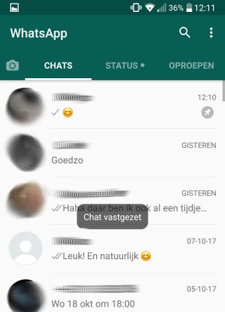 In Android is het net zo eenvoudig. Houd het gesprek dat je wilt vastpinnen ingedrukt, en er verschijnt bovenaan in het scherm van de app een pin icoontje. Als je hierop drukt, wordt het gesprek vastgepind. Naast het gesprek komt een pin icoontje te staan, waarmee je het gesprek ook weer los kunt maken.