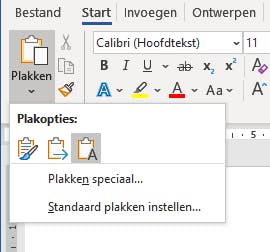 Wanneer je met Ctrl+C, tekst kopieert, kopieer je heel wat meer dan de woorden. Je neemt ook de onzichtbare opmaak-elementen mee. Uiteraard wil je in het Word-document zelf bijvoorbeeld het lettertype, de lettergrootte, stijl, tekstkleur en regeleinden bepalen. Nadat je de brontekst hebt gekopieerd kun je de tekst zonder opmaak plakken via een knop in het lint. Hiervoor klik je eerst met de linkermuisknop op de positie waar de geplakte tekst straks moet komen. En daarna klik je op het kleine pijltje dat bij het pictogram Plakken in het tabblad Start staat. Dat is makkelijk om vinden, want dat is de eerste knop van links. Er verschijnen enkele mogelijkheden en daar kies je het pictogram van het klembord met de letter A. Dat is de knop Alleen tekst behouden. Je kunt ook met de rechtermuisknop in de tekst klikken en dan bij de plakopties dezelfde knop kiezen.