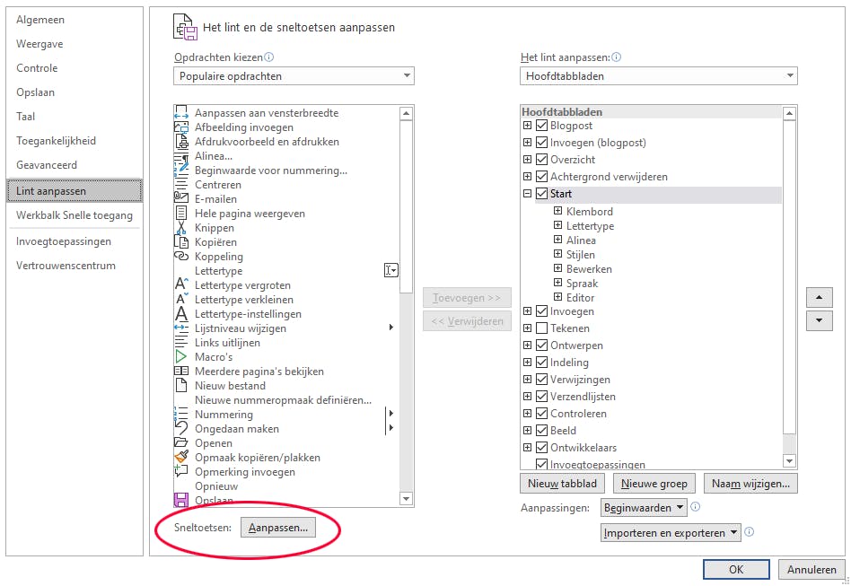 Als je dit vaak doet, dan is een sneltoets veel handiger. Word heeft geen shortcut om te plakken zonder opmaak, maar je kunt die wel makkelijk zelf maken. Ga in Word naar Bestand en selecteer dan de Opties. In het venster Opties voor Word selecteer je in de linkerkolom Lint aanpassen. Wanneer dit venster geopend is, zie je helemaal onderaan de knop Aanpassen naast de verwijzing Sneltoetsen.