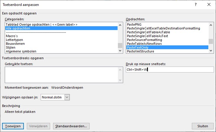 Om zelf een sneltoets te creëren, selecteer je hier in het eerste vak een categorie. Scrol naar beneden en selecteer de categorie Alle opdrachten. Op deze manier kun je makkelijk zoeken tussen alle opdrachten. Het tweede vak, Opdrachten, is alfabetisch gerangschikt. Daar klik je op de opdracht PasteTextOnly. Wanneer die is geselecteerd, klik je in het vak Druk op de nieuwe sneltoets en dan toets je de gewenste combinatie in. Kies een combinatie die nog niet in gebruik is en die je gemakkelijk onthoudt. Klik op de knop Toewijzen en sluit dit venster. Daarna test je de sneltoets door een stukje van een webpagina te kopiëren en te plakken met de nieuwe sneltoets.