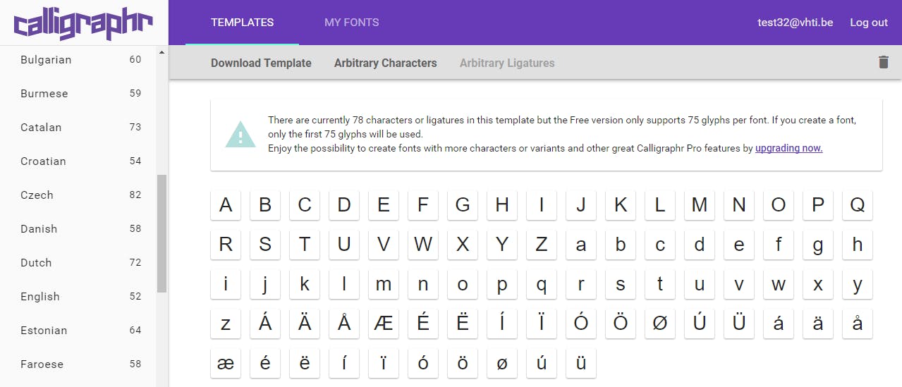 Alles begint met een bezoek aan www.calligraphr.com (vroeger www.myscriptfont.com). Het is misschien een goed idee eerst even de rubriek Pricing te openen. Hier zie je dat je geheel gratis een font kunt creëren, met als belangrijkste beperking dat het ‘slechts’ 75 tekens kan bevatten. Kun je daar mee leven, klik dan op Great, Let’s try Calligraphr en vervolgens op Get started for free. Vul een geldig e-mailadres en een wachtwoord (2x) in en klik op Submit. Even later ontvang je een mail met een bevestigingslink om op te klikken. Aangemeld op de site klik je op Start app en vervolgens op Create a template. Selecteer de gewenste taal in het linkerpaneel – Dutch wellicht – en druk op de knop Download Template. Bevestig met Download om het bijhorende pdf-bestand op te halen.