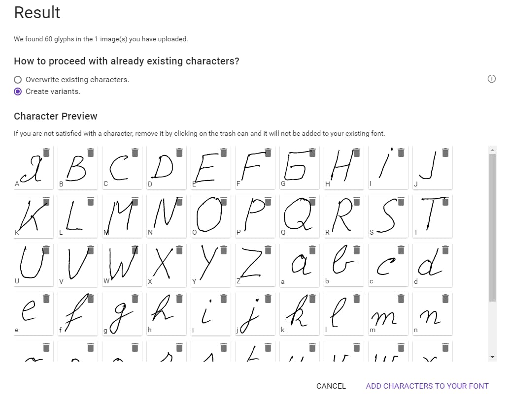 Terug naar de website, waar je bovenaan My Fonts aanklikt en vervolgens Upload Template selecteert. Druk op de knop Bestand kiezen en verwijs naar de scan of foto. Bevestig met Upload Template. Even later verschijnt het resultaat. Een minder geslaagd teken verwijder je desnoods via de bijhorende prullenmand. Het is ook mogelijk een extra sjabloon te uploaden, waarbij je dan de keuze krijgt bestaande tekens te overschrijven of varianten voor die tekens te creëren. Bevestig met Add characters to your font.