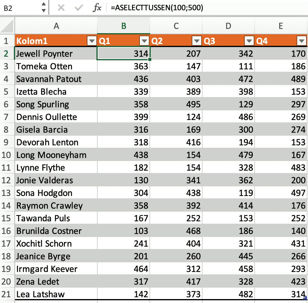 Er is ook een manier om willekeurige getallen tussen twee bepaalde waarden te genereren. Wil je bijvoorbeeld getallen zien tussen 100 en 500, dan gebruik je de formule =ASELECTTUSSEN(100;500). De formule =ASELECT()*100 levert een willekeurig getal groter dan of gelijk aan 0 en kleiner dan 100. Ook hier kun je de getallen weer afronden met de functie INTEGER. De formule wordt dan =INTEGER(ASELECTTUSSEN(100;500)).