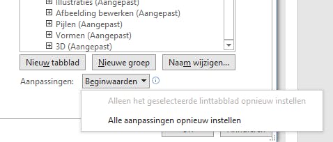 Krijg je later spijt van een tabblad, groep of opdracht die je hebt toegevoegd, dan kun je hem gemakkelijk verwijderen door er in het instellingenvenster met de rechtermuisknop op te klikken en voor Verwijderen te kiezen. Wil je in één keer alle aanpassingen ongedaan maken, dan kan dat uiteraard ook. Onder de tweede kolom klik je bij Aanpassingen op Beginwaarden, waar je de opdracht Alle aanpassingen opnieuw instellen kunt selecteren.