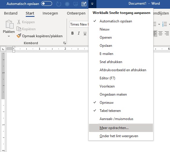 Om bepaalde functies die je vaak nodig hebt sneller bij de hand te hebben, is er de werkbalk Snelle toegang. Dit is de smalle horizontale balk die boven het lint staat. Waarschijnlijk staat er bij jou in Snelle toegang al de knop Automatisch opslaan. Ook deze werkbalk is helemaal naar wens aan te passen door er veelgebruikte opdrachten aan toe te voegen. Klik in die balk op de knop met het pijltje dat naar beneden wijst. Hier staan functies bij die je simpelweg kunt aanvinken, zodat er knoppen in deze balk bijkomen zoals Nieuw, Openen, Opslaan, Snel afdrukken enzovoort.