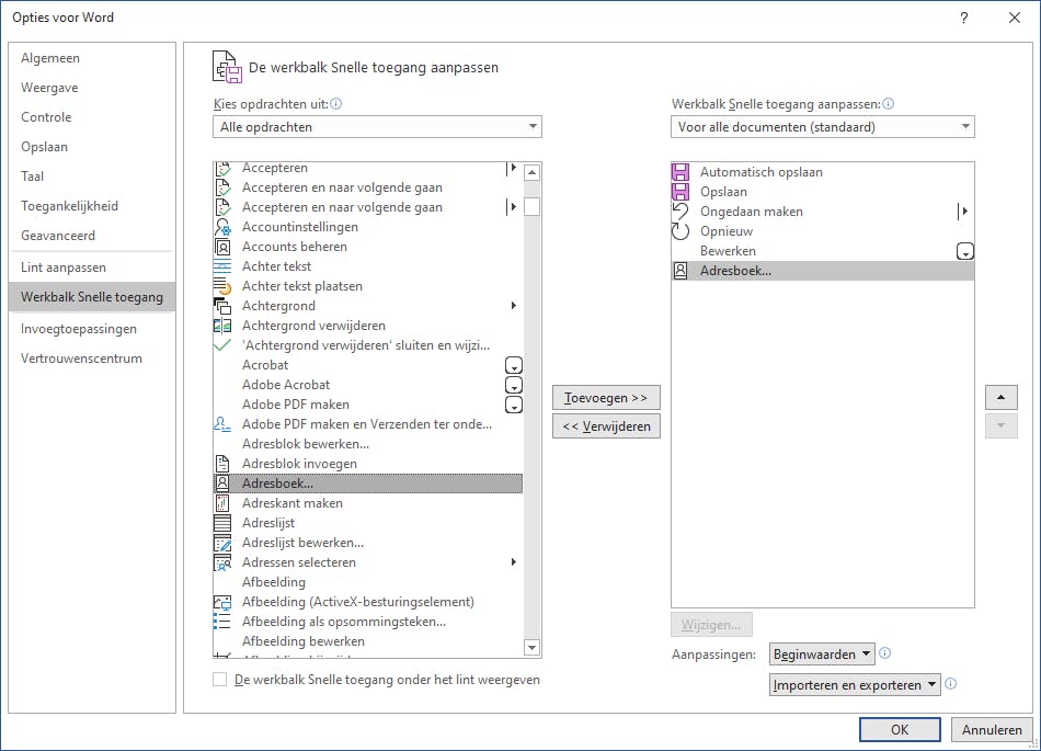 Een opdracht in Snelle toegang die voor sommige gebruikers nuttig zal zijn, is de functie Adresboek. Hiermee kun je in je Word-documenten rechtstreeks de gegevens invoeren van je Outlook-contacten. Hoe je dat doet? Selecteer via het pijltje de knop Meer opdrachten. Hierdoor opent het venster Opties voor Word, en ga naar de rubriek Werkbalk Snelle toegang. In eerste instantie zie je in de linkerkolom Populaire opdrachten, maar daar vind je niet wat je nu nodig hebt. Wijzig deze instelling in Alle opdrachten, zodat je een alfabetisch geordende lijst krijgt van alle opdrachten die beschikbaar zijn. Selecteer in deze lange lijst de opdracht Adresboek en gebruik daarna de knop Toevoegen. Bevestig met OK om dit venster te sluiten.