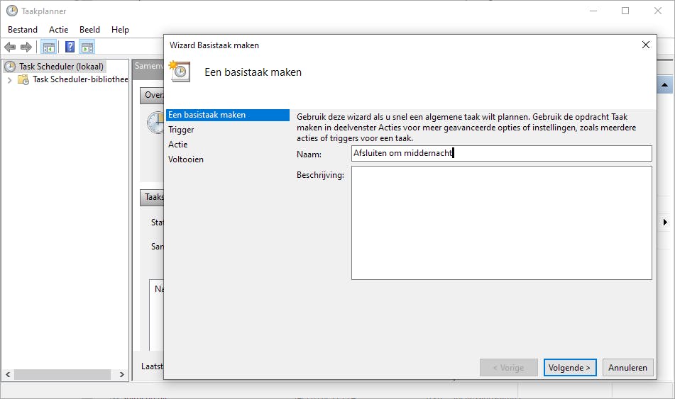 Met de Taakplanner kun je de pc automatisch laten afsluiten op een vastgesteld tijdstip. Open de tool door taakplanner te typen in het zoekvak van het startmenu. Daarna gebruik je het menu Actie waar je Basistaak maken selecteert. Geef deze nieuwe taak een herkenbare naam bijvoorbeeld ‘Afsluiten om middernacht’. Eventueel kun je de taak nog toelichten met een beschrijving. Als je op Volgende klikt, kom je in het tabblad Trigger, waar je aangeeft op welke dagen de pc deze taak moet uitvoeren. Ga je voor Dagelijks dan geef je aan op welke datum deze taak voor het eerst moet worden uitgevoerd. Daarnaast voer je het tijdstip in.
