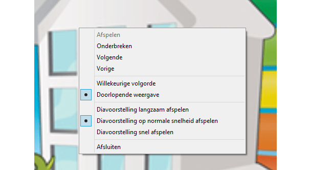 Waar je in de moderne versie alleen controle hebt over spelen en stoppen door op de spatiebalk te drukken (hetgeen in deze oudere versie ook werkt), kun je in deze versie nog meer bepalen. Klik je namelijk met je rechtermuisknop op een plek in de diavoorstelling, dan vind je handige opties waarmee je de voorstelling kunt manipuleren. Zo kun je aangeven dat de voorstelling sneller of langzamer moet afspelen, maar ook dat de volgorde willekeurig moet zijn of juist precies in de juiste volgorde. Dat geeft je veel meer controle en toont ook aan dat nieuwer niet altijd beter is.