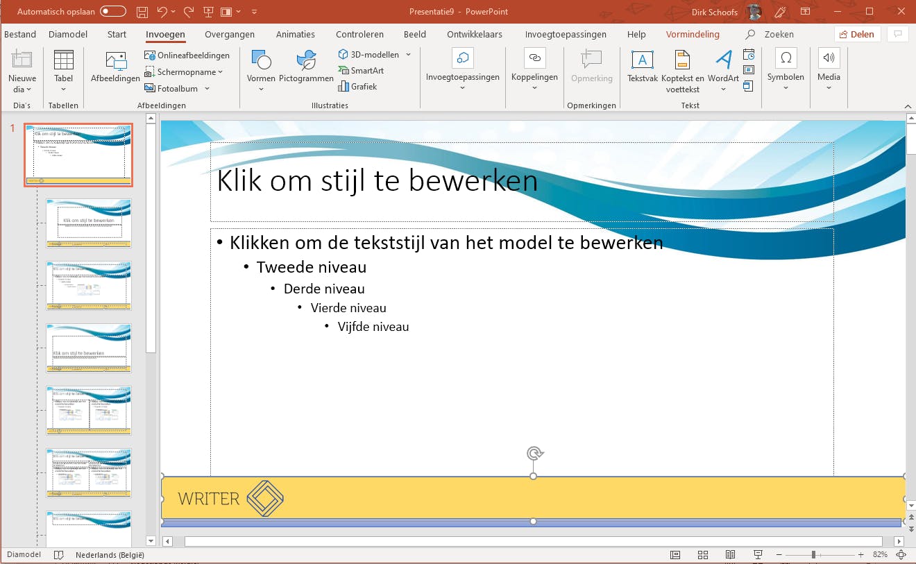 Ben je klaar met het bewerken van het diamodel, klik dan op het tabblad Diamodel bij Sluiten op Modelweergave sluiten. Je ziet dan een presentatie van slechts één dia. Sla deze nu op als sjabloon om te vermijden dat iemand de elementen ervan wijzigt. Kies Bestand / Opslaan als en selecteer PowerPoint-sjabloon. Wanneer iemand vanaf nu een nieuwe dia vanuit het sjabloon wil maken, kan hij kiezen uit alle indelingen die bij het opgemaakte diamodel horen.