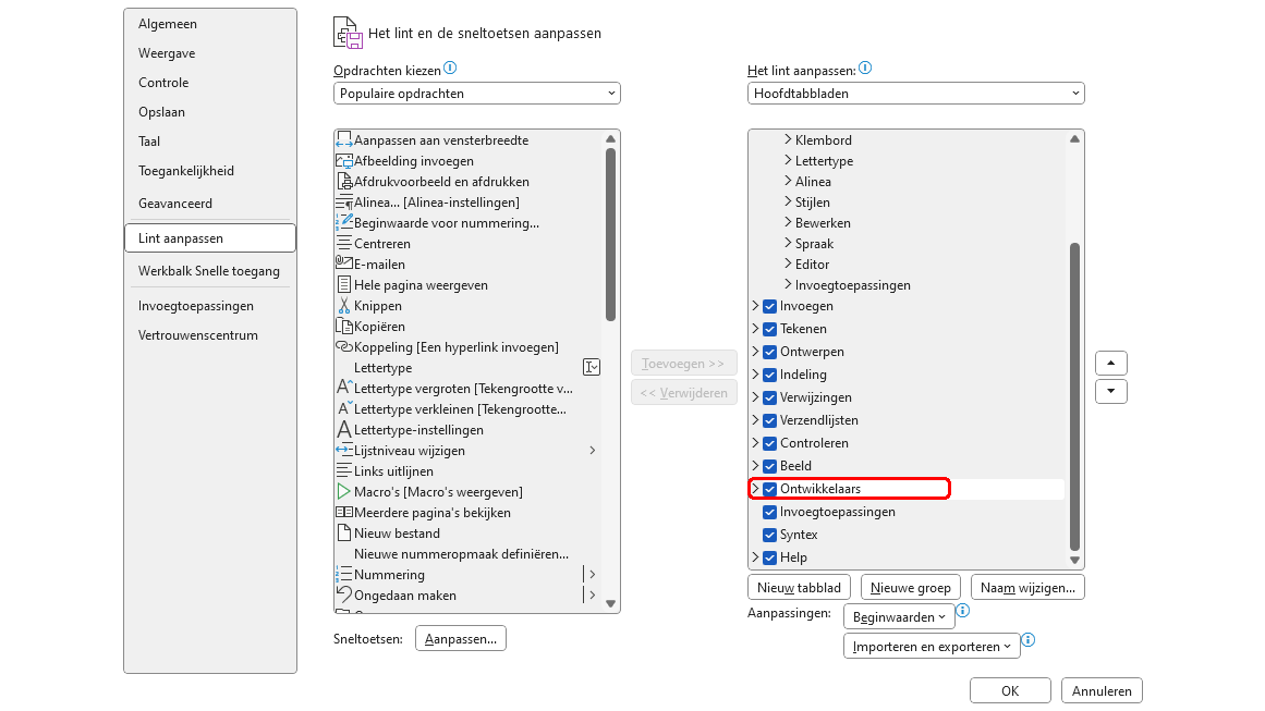 Als je vakjes wilt toevoegen die je zelf of iemand anders in Word kan afvinken, dan moet je eerst het tabblad Ontwikkelaars aan het lint toevoegen. Ga via Bestand naar Opties. In het dialoogvenster dat je nu ziet, selecteer je aan de linkerkant de optie Lint aanpassen. Hierdoor opent rechts een lijst. Zorg dat er een vinkje staat bij Ontwikkelaars. Klik op OK.