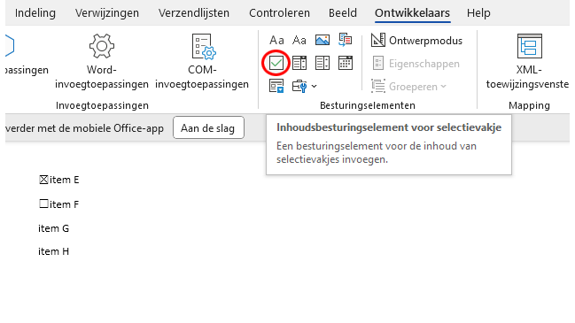 Nu ga je naar de lijst die je hebt klaargemaakt zonder opsommingstekens. Plaats de muisaanwijzer voor het eerste item en open het tabblad Ontwikkelaars. In de groep Besturingselementen vind je het selectievakje. Als je daarop klikt, verschijnt er een interactief vakje. Klik op de volgende plaats waar nog zo’n vakje moet komen en gebruik de toetscombinatie Ctrl+Y om de actie van zojuist te herhalen. Doe dit voor ieder item in de lijst. Er is helaas nog geen optie om alle items in één keer van selectievakjes te voorzien. Als het document klaar is, kun je gewoon op zo’n vakje klikken en vervolgens verschijnt er een kruisje in het afvinkvak.