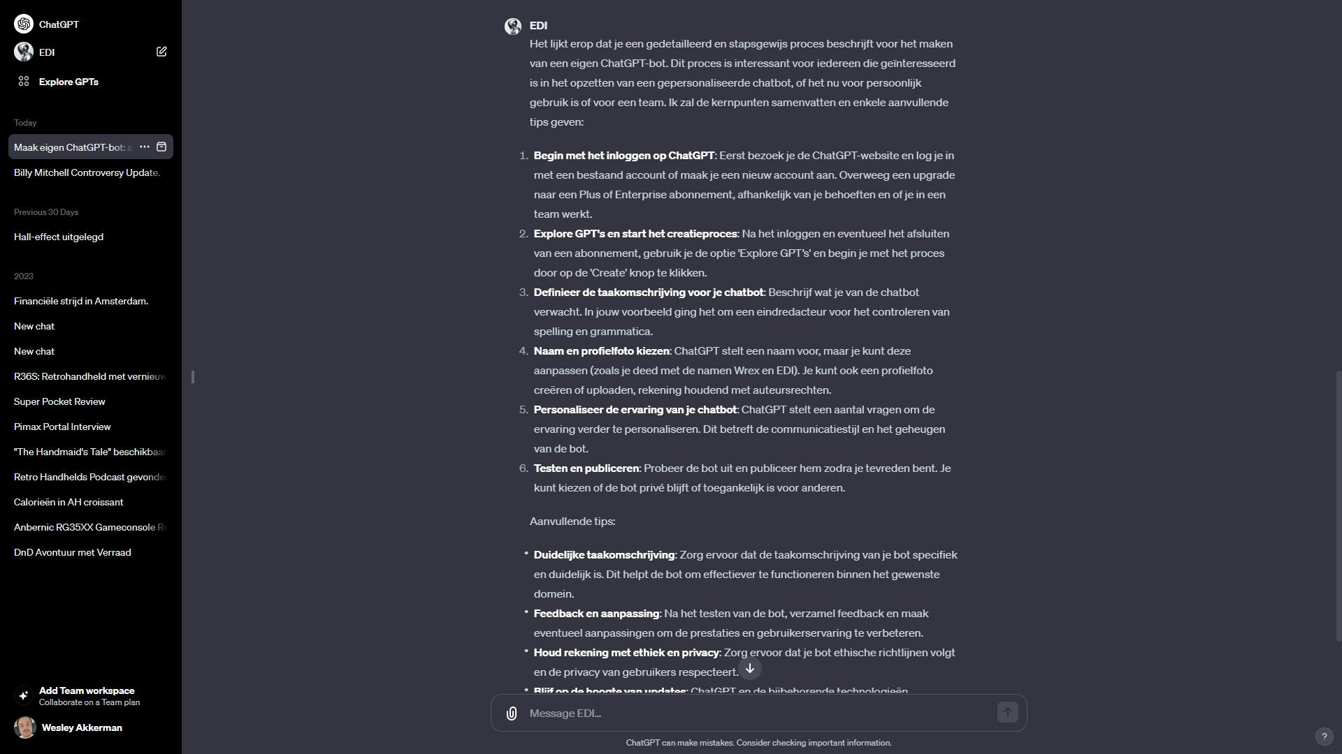 Zodra je deze stappen afgerond hebt, zal ChatGPT je nog een aantal vragen stellen, waarmee je de ervaring van je chatbot verder kunt personaliseren. Dat duurt een paar minuten, maar vanaf dat moment heb je wel een bot die helemaal tot je dienst staat.