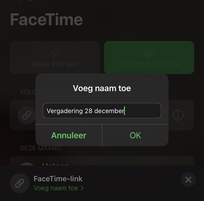 Na afloop van het gesprek kun je de link weer verwijderen door in de FaceTime-app op het groene i-icoontje te drukken en vervolgens te kiezen voor Verwijder link.
