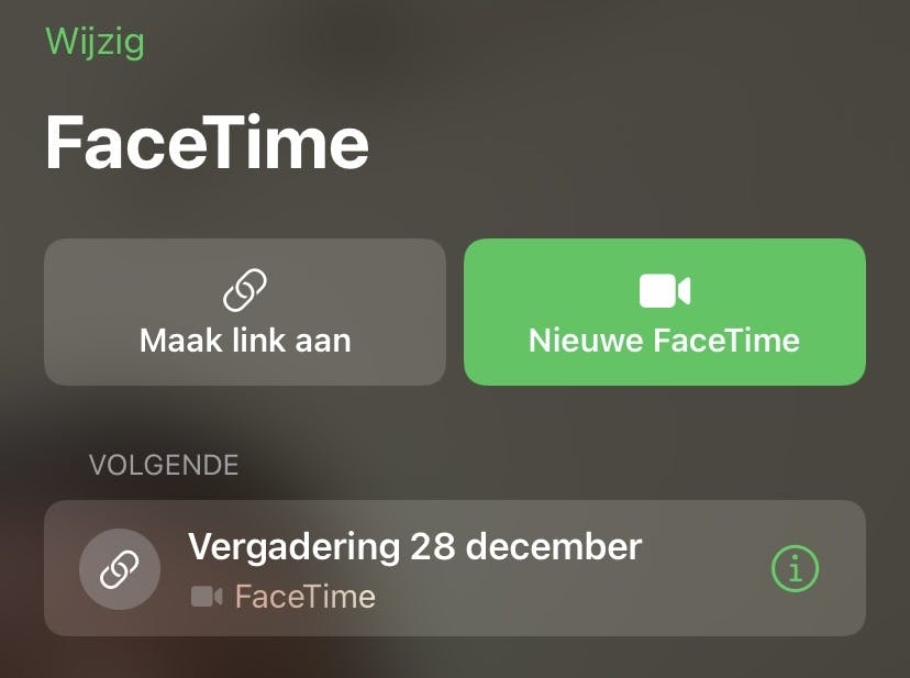 De link kun je altijd vinden in de FaceTime-app onder Volgende. Klik op de link en tik rechtsboven op Neem deel om de videovergadering te starten. Je contactpersonen kunnen op dezelfde link klikken om deel te nemen aan de vergadering. De link wordt voor hen direct geopend in de FaceTime-app of in de browser als zij niet op een Apple-apparaat zitten.