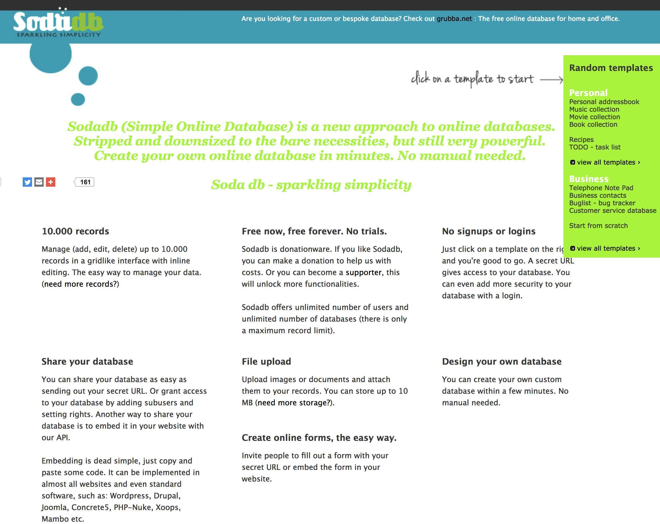 Er bestaan nogal wat gratis online database-oplossingen. Wij gebruiken hier Sodadb (Simple Online Database), een online databasebeheerder die trots is op zijn gebruiksvriendelijkheid. Om het de gebruiker zo makkelijk mogelijk te maken, hebben de makers de specialistische functionaliteiten gedumpt. In de gratis versie kun je tot 10.000 records beheren, wat voor de meeste thuisgebruikers meer dan voldoende is. Wil je dit optrekken tot 35.000 records, dan betaal je 3,49 dollar per maand. In Sodadb is het mogelijk externe bestanden te uploaden om ze aan records te koppelen, maar in de gratis versie is de opslagruimte erg beperkt. Je kunt de database via een webadres delen en aanpassen. Bovendien versleutelt Sodadb de verbinding met de server, zodat je gegevens beveiligd zijn. En ten slotte is er in principe geen aanmelding vereist. Surf naar www.sodadb.com en begin.