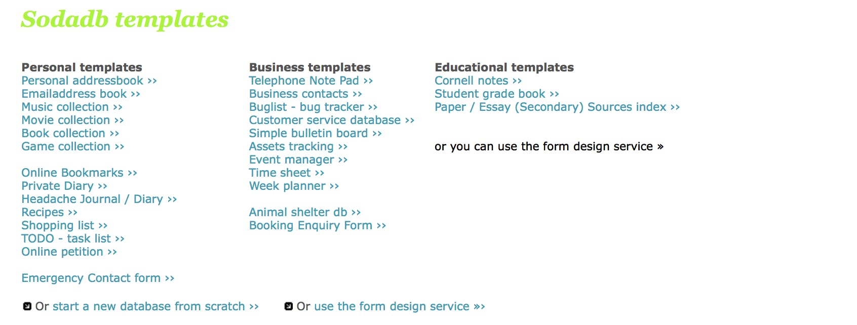 Heb je nog nooit met een database gewerkt, dan bekijk je het best even de sjablonen. Rechtsboven staan de Templates in het groene vak. Die zien er veelbelovend uit: een persoonlijk adresboek, een muziekverzameling, een film- en boekencollectie, zakelijke contacten en meer. Je kunt de set sjablonen uitvouwen en dan krijg je nog meer: een online petitie, een klantenbestand enzovoort. Onder deze koppelingen zie je trouwens ook de link Start from Scratch voor wie vanaf nul wil beginnen. De sjablonen zijn georganiseerd in Personal en Business. Vind je het ontwerpen van de gegevensbank toch te moeilijk, dan is de ontwerper bereid de database aan te passen aan je persoonlijke wensen, hiervoor vraagt hij slechts een kleine donatie.