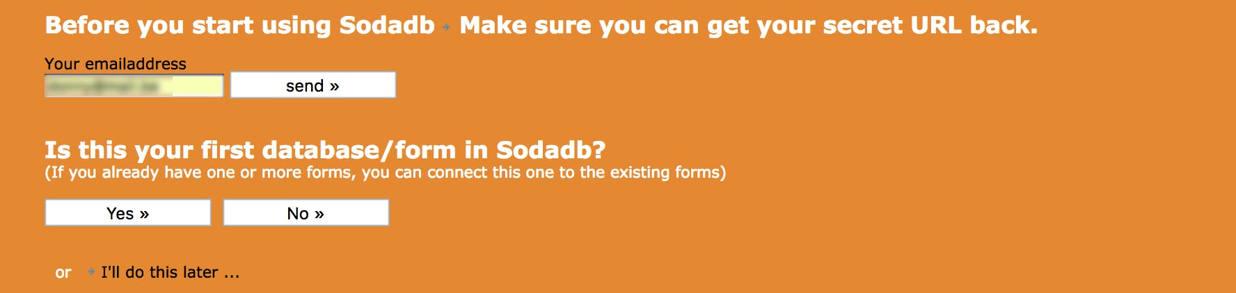 Laten we starten vanaf Personal addressbook. In het volgende venster blokkeert een brede oranje balk een deel van het scherm. Sodadb vraagt je e-mailadres om je database op een geheim internetadres te publiceren. Via deze persoonlijke url zal het programma het ontwerp en alle instellingen opslaan voor de volgende keer. Nadat je jouw mailadres hebt opgegeven, vraagt Sodadb of dit je eerste online database is. Als je nog meer databases hebt gemaakt met deze tool, kun je deze samen beheren. Wanneer je gewoon het sjabloon gewoon even wilt bekijken, klik je op I’ll do this later.