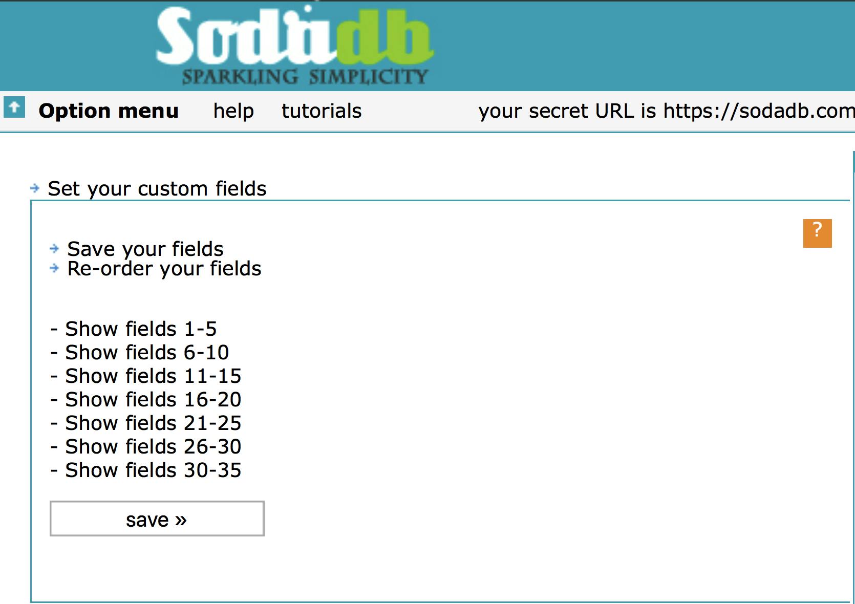 In het werkvenster van het persoonlijke adresboekje lees je de mededeling No records found. Een database is opgebouwd uit records die je kunt vergelijken met informatiefiches. Ieder record bevat gegevens in verschillende velden. De namen van de velden staan vetgedrukt. Op dit moment staan die veldnamen in het Engels. Om die velden aan te passen moet je naar het Option menu, linksboven. Open dit menu en klik op Set up your custom fields. Bij Sodadb mag ieder record maximaal 35 velden bevatten: dat is een heleboel informatie. Om het een beetje overzichtelijk te houden, bundelt Sodadb die 35 velden in groepjes van 5.
