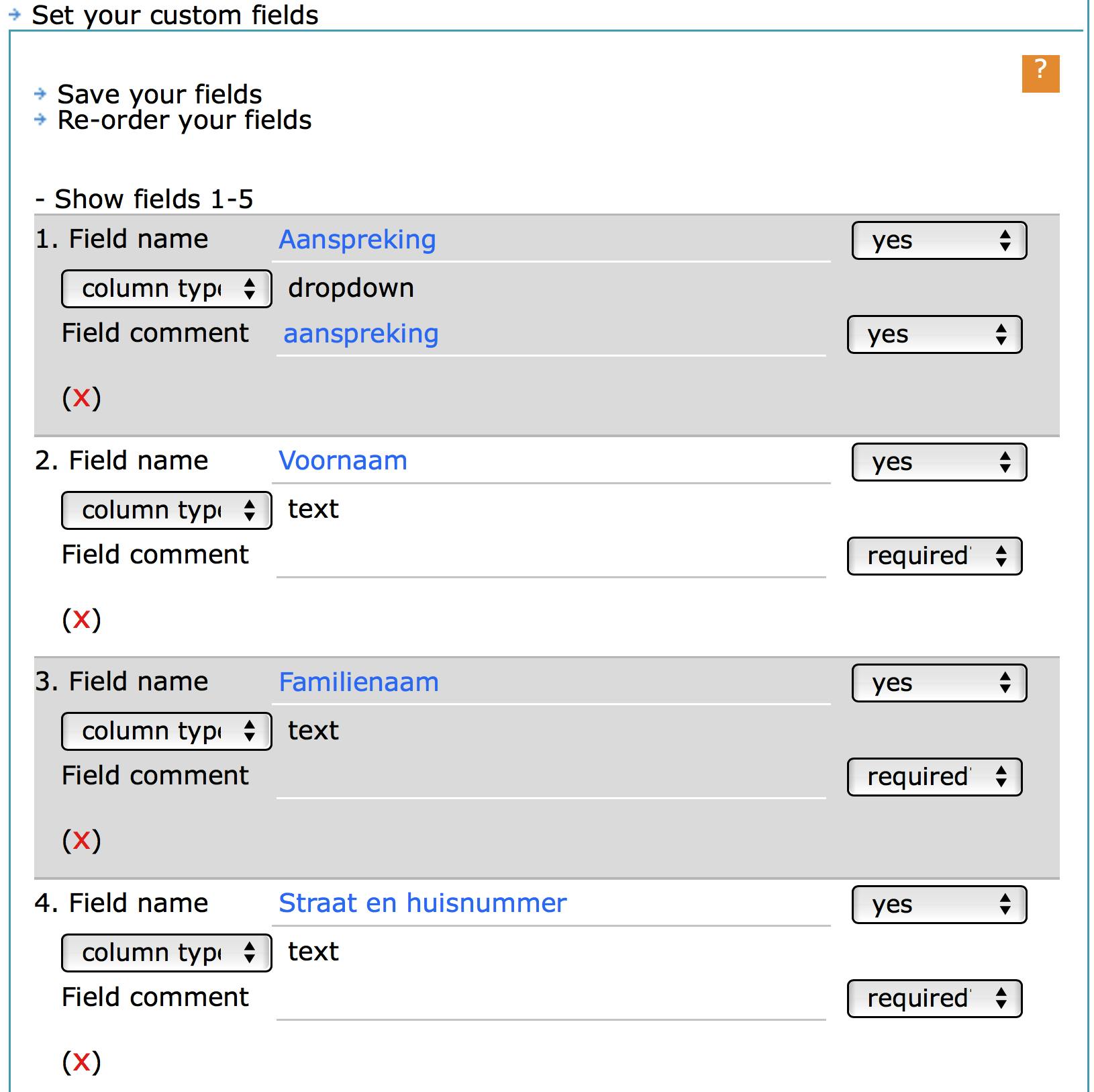 Klik op de eerste groep: Show fields 1-5. Om te beginnen kun je de Engelse veldnamen vervangen door Nederlandse termen. Wanneer er in het sjabloon velden staan die je niet wilt tonen, kun je die onzichtbaar maken door de instelling Visible op No in te stellen. Bij iedere veldnaam mag je helptekst toevoegen. Dat is tekst die straks lichtgrijs onder het veld verschijnt om gebruikers te helpen alle gegevens correct in te voeren. Op die manier geef je bijvoorbeeld aan hoe een datum moet worden genoteerd. In deze sjabloon zijn de velden 1 tot 5 allemaal van het Column type. Tevreden over deze eerste vijf? Pas daarna dan de velden 6 tot 10 aan, en zo verder. Vergeet niet op de Save-knop te klikken voor je dit venster sluit.