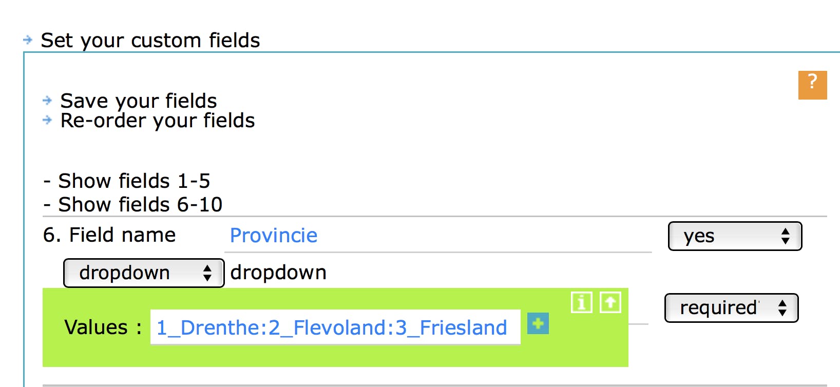 Om in een bepaald veld slechts bepaalde keuzemogelijkheden toe te laten, werk je met een dropdown-menu. In dit voorbeeld zullen we in veld 6 de provincie noteren. Om het type van invoerveld te bewerken klik je op de knop links waar nu column type staat. Hier selecteer je de optie dropdown. In het groene vak geef de nieuwe keuzewaardes in, bijvoorbeeld: 1_Drenthe:2_Flevoland:3_Friesland enzovoort.