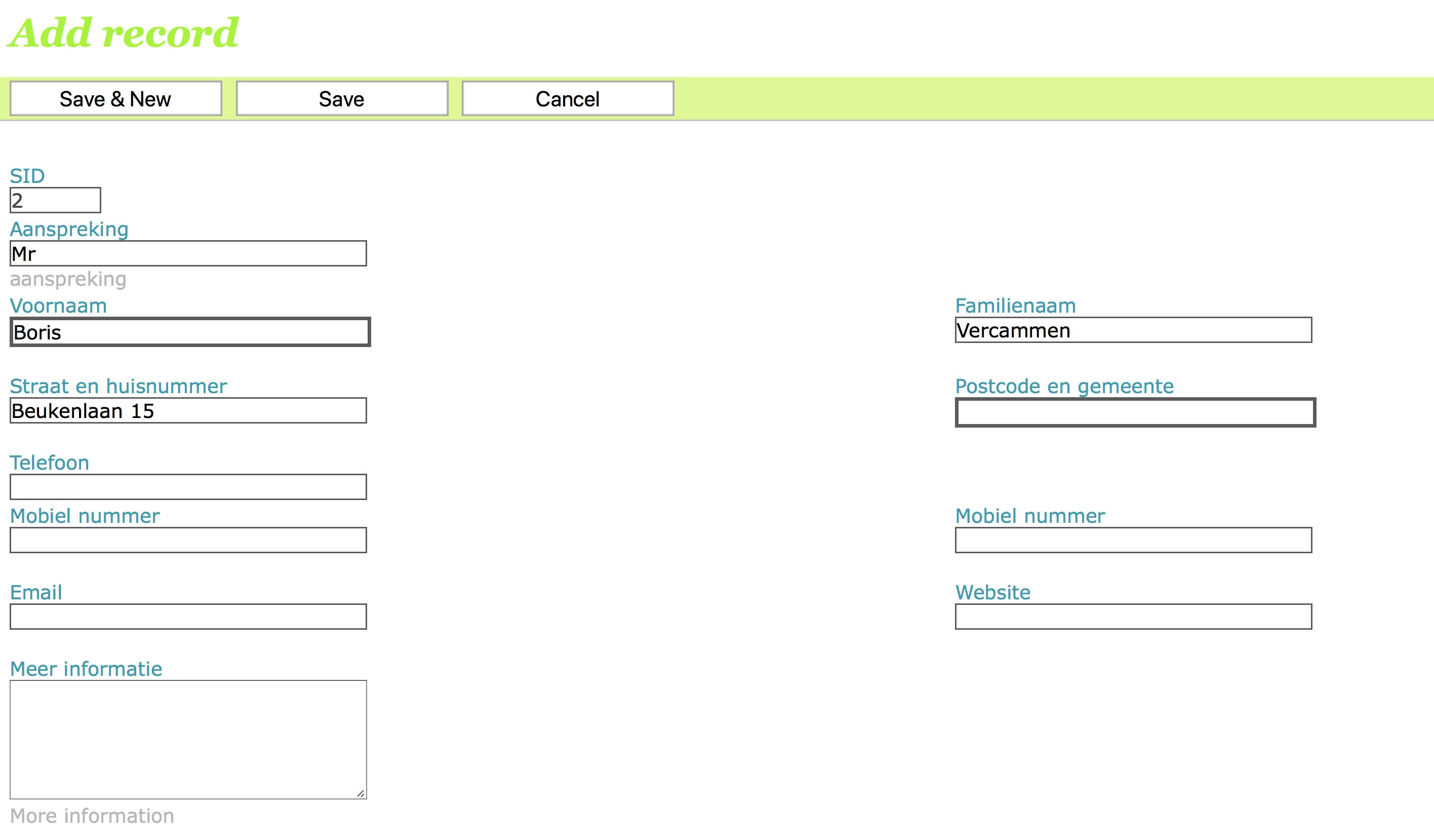 Alle veldnamen die je hebt aangepast, zien er netjes uit en ook de helptekst is helder. Wanneer alle velden klaar zijn, kun je het eerste record handmatig invullen. Klik op de knop New en dan verschijnt het eerste fiche, dat meteen een volgnummer heeft gekregen. Heb je het eerste fiche ingevuld, dan is er de knop Save & New om het volgende record klaar te zetten. Ben je klaar, dan klik je op Save. Hierdoor keer je terug naar het kolomoverzicht waar alle records onder elkaar verschijnen.