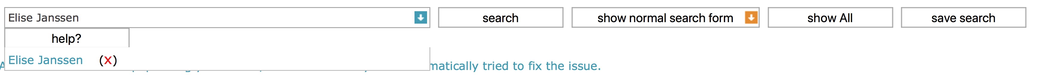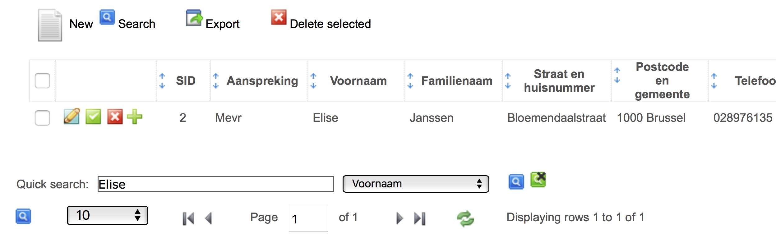 Wanneer de database uit honderden of misschien zelfs duizenden records bestaat, kun je niet zonder zoekfunctie. Met het zoekformulier raadpleeg je de gegevensbank aan de hand van verschillende logische vergelijkingen. Veronderstel dat je de gegevens wil zoeken van Elise Janssen, dan klik je op Show normal search form. Hierdoor verschijnt een zoekformulier waarin alle velden beschikbaar zijn. Je geeft naast het zoekveld bij Voornaam de term Elise in en bij Achternaam de term Janssen. Vervolgens klik je op de Search-knop onder de zoekwoorden om de records te vinden die aan deze zoekopdracht voldoen.