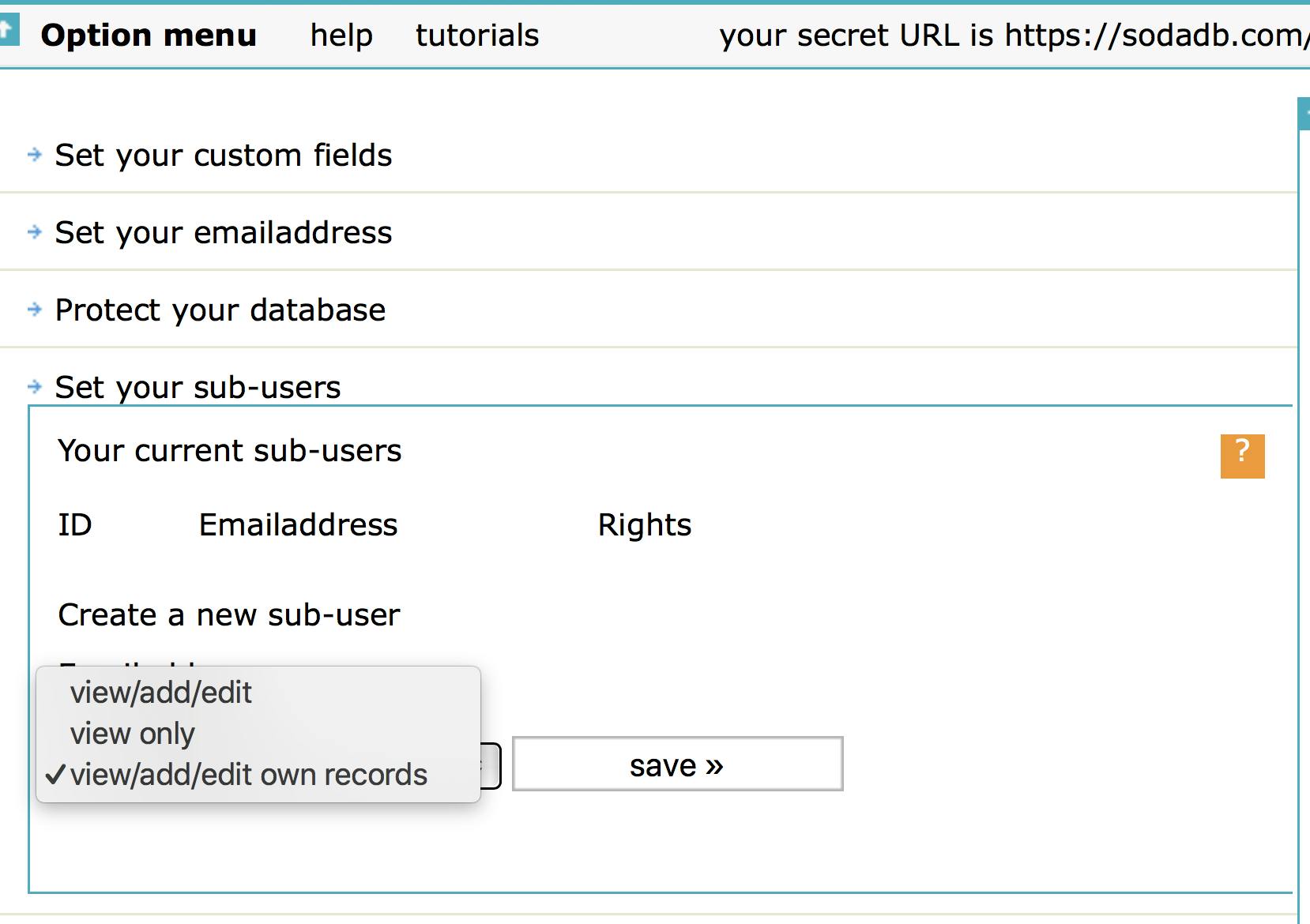 Om de informatie uit de database te delen, voeg je gebruikers toe. Sommigen mogen de gegevens bekijken, anderen mogen ook informatie invoeren en wijzigen. Klik daarvoor op Option menu. Eerst moet je de database beschermen via de knop Protect your database. Daarvoor moet je jouw e-mailadres invoeren (als dat nog niet zou zijn gebeurd). Vervolgens klik je in Option menu op de opdracht Set your sub-users. Je voert de e-mailadressen in van de personen die toegang krijgen tot de database. Tegelijkertijd beslis je of ze de records mogen bekijken of toevoegen en wijzigen. De derde mogelijkheid is dat ze alleen toegang krijgen (kijken, toevoegen en wijzigen) tot de records die ze zelf invoeren.