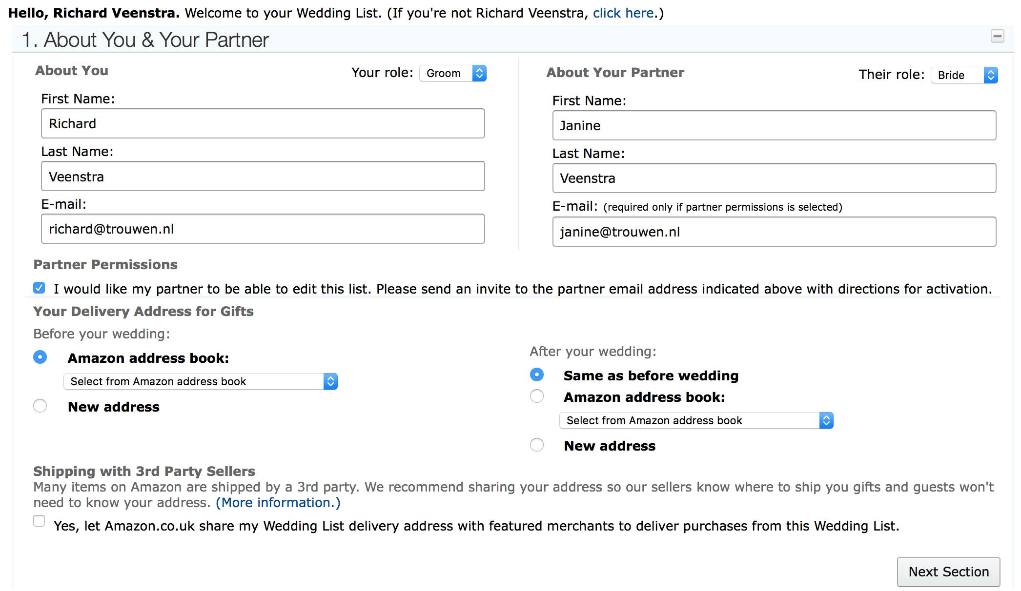 Slim is dat je een verzendadres vóór en ná de huwelijksdatum en kunt aangeven