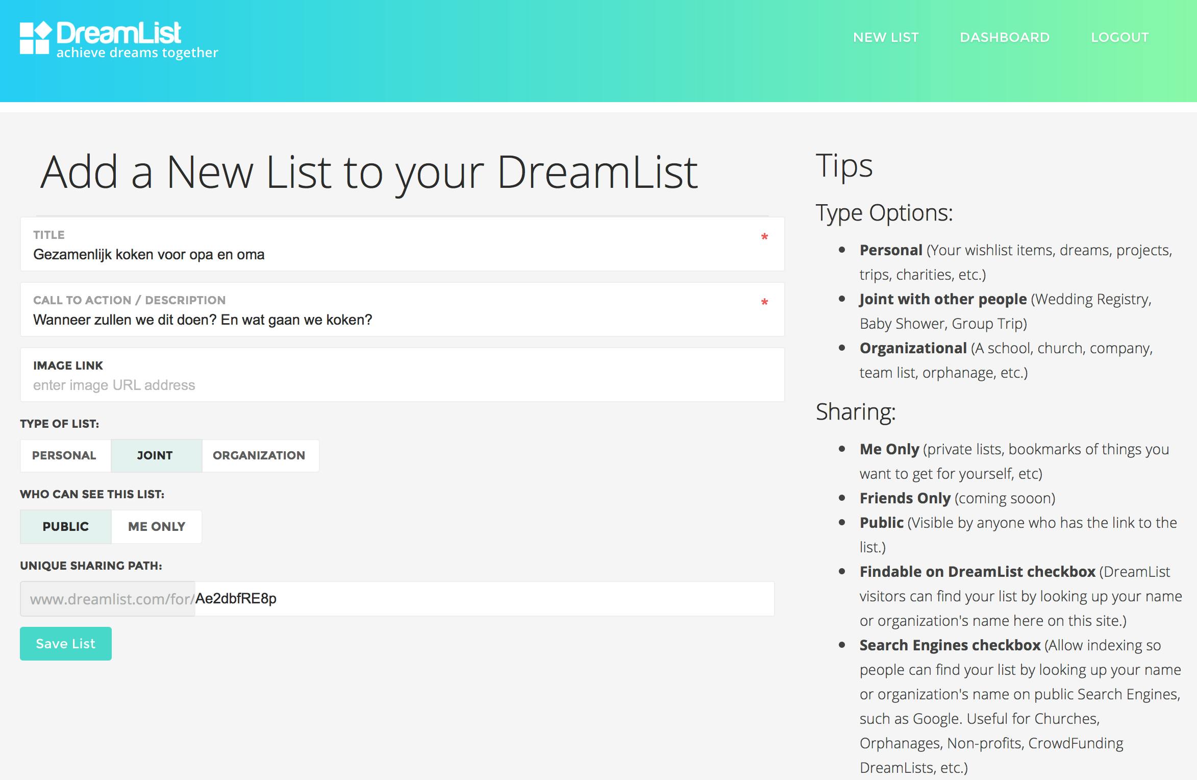 Een nieuwe site die het over een andere boeg gooit, is DreamList. Met de site kun je wensen formuleren en deze met anderen proberen te realiseren. Het gaat dan niet over een paar cadeautjes voor je verjaardag of pakketjes onder de kerstboom, maar meer om wensen als gezamenlijk koken met de hele familie voor je zieke grootouders of elke maand een bepaald bedrag sparen om met vrienden op vakantie te gaan. Onder Create your Dream List geef je je registratiegegevens op en onder Your Lists creëer je een nieuwe wenslijst door op Add a new list te klikken. Onder Type of list geef je aan of dit een gezamenlijke wens met andere personen (joint) is of dat je het met een vereniging (organization) wenst te realiseren. Klik op Save list en onderaan klik je op Add a new wish. Hier selecteer je nu iets wat met je wens te maken heeft. Gift idea is een traditionele verlanglijst, maar als je op Fun together klikt, kun je bijvoorbeeld een koppeling naar een website van een activiteit toevoegen. De website is nog in bèta-stadium, maar functioneert al wel volledig.