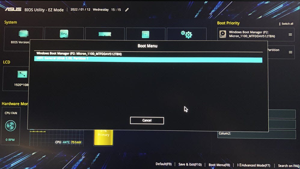 De UEFI is systeemsoftware waarin je allerlei zaken van de computer kunt regelen. Zoek het opstartmenu op. Meestal staat dat aangegeven met Boot of Boot Menu. Selecteer de juiste usb-stick als opstartstation. Herstart nu het systeem. Als het goed is, verschijnt het logo van de betreffende Linux-distributie in beeld. Je kunt nu de installatie in orde maken.