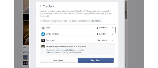 Als je op Volgende klikt, kun je de instellingen wijzigen voor de apps die aan je Facebook account gelinkt zijn.