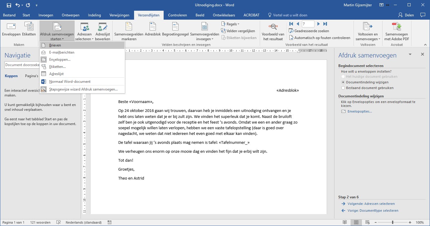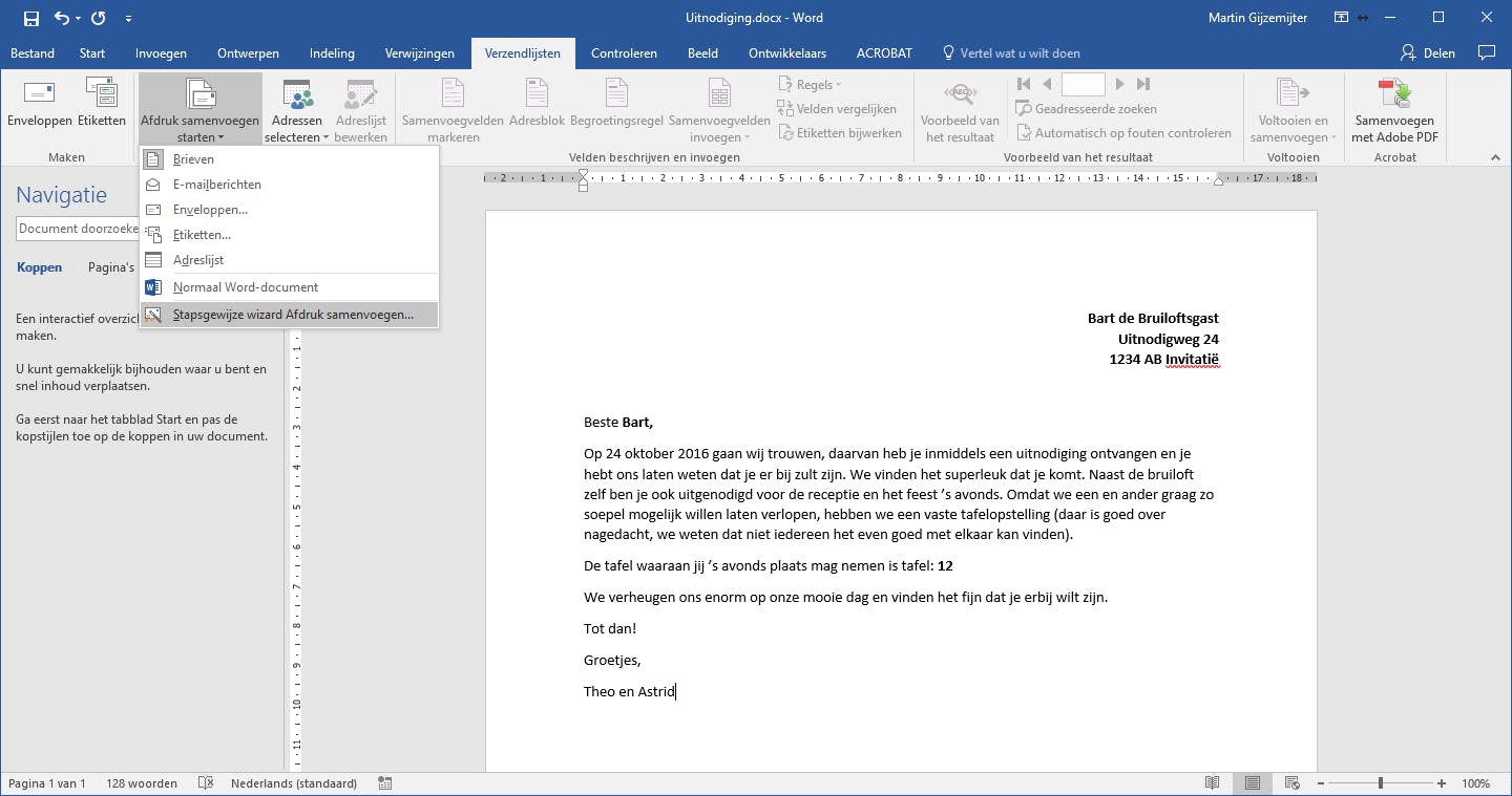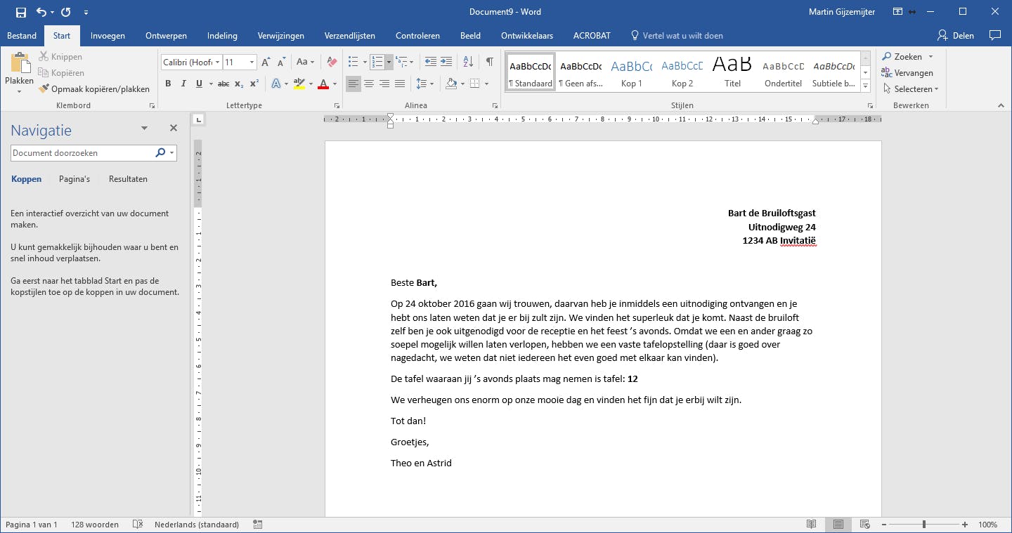 Nu je in de basis een idee hebt van wat je in je document (in ons geval een brief) wilt zetten, wordt het tijd om dat daadwerkelijk uit te werken. Start Word en maak een nieuw document, via Bestand / Nieuw / Leeg document. Je kunt er overigens ook gewoon voor kiezen om een sjabloon te gebruiken, dat heeft geen invloed op het eindresultaat. Maak vervolgens het document of schrijf de brief die je uiteindelijk wilt versturen. Maak deze brief helemaal compleet, inclusief aanhef, adres rechtsboven (indien van toepassing) en in ons geval: toewijzing van de tafelnummers. Maak de gegevens die je straks automatisch wilt laten invullen even vetgedrukt, dan vergeet je het straks niet. Door de brief volledig te maken, heb je voor jezelf een concreet overzicht of je niets bent vergeten. Controleer het document en laat het eventueel nog controleren door andere belanghebbenden (je partner, collega enzovoort) om te zien of je niets bent vergeten. Sla het document op.